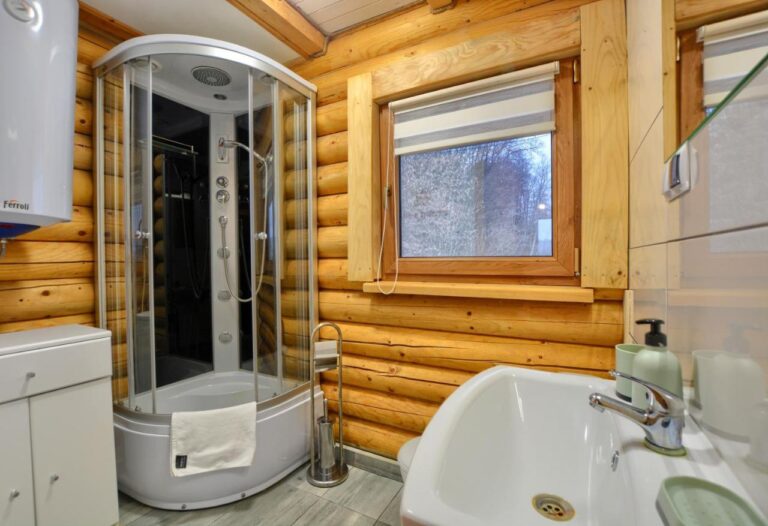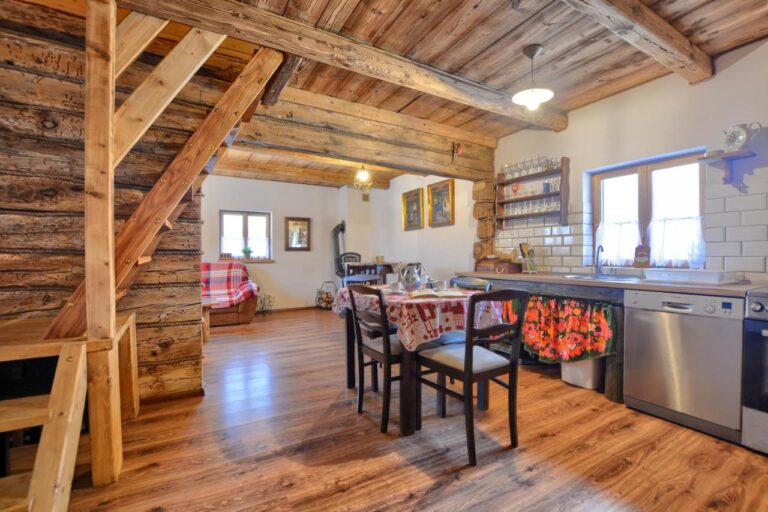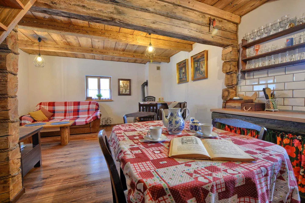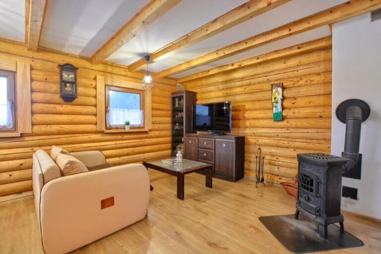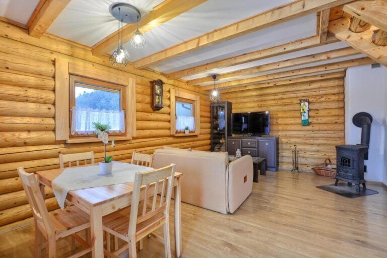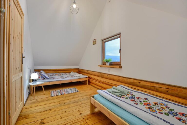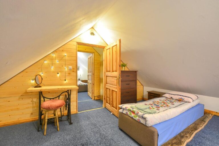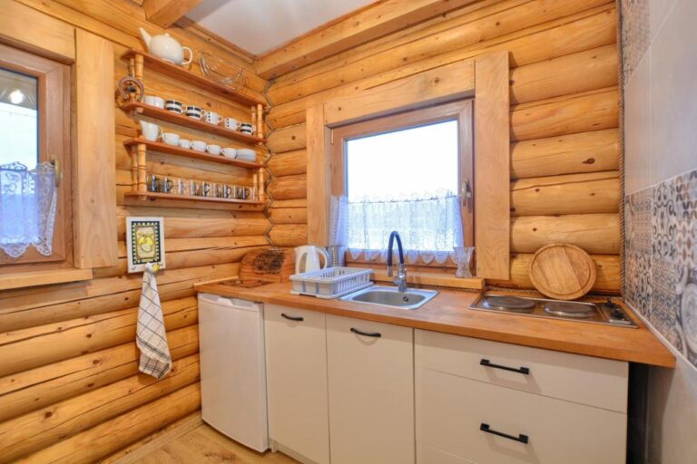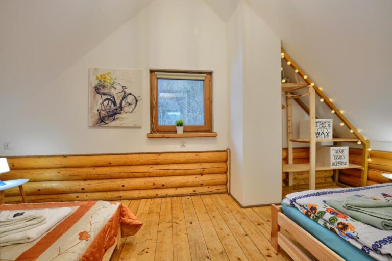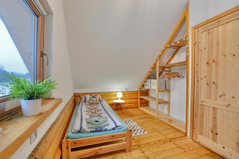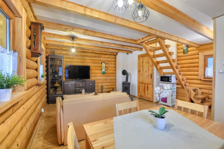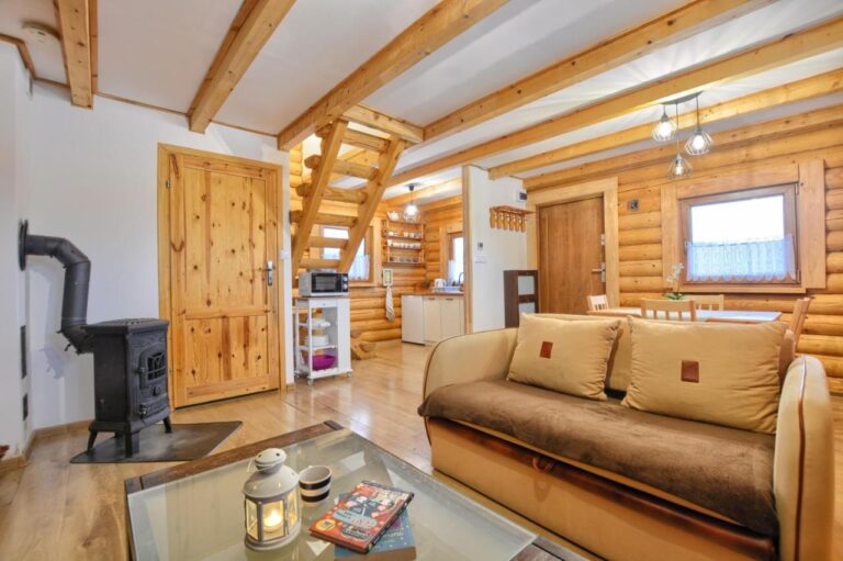Domek „Baba Jaga” pomieści 6 osób (max 8 po rozłożeniu sofy w salonie). Na dole salon z aneksem kuchennym i toaleta z prysznicem. Na górze dwa oddzielne pokoje 3 osobowe.