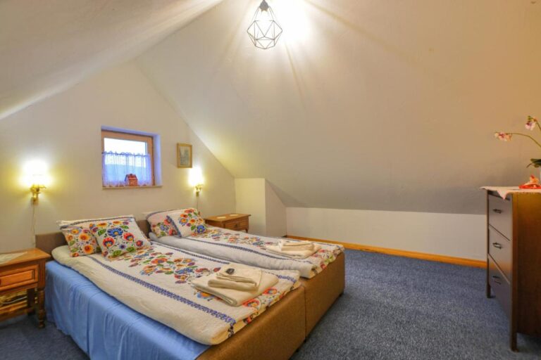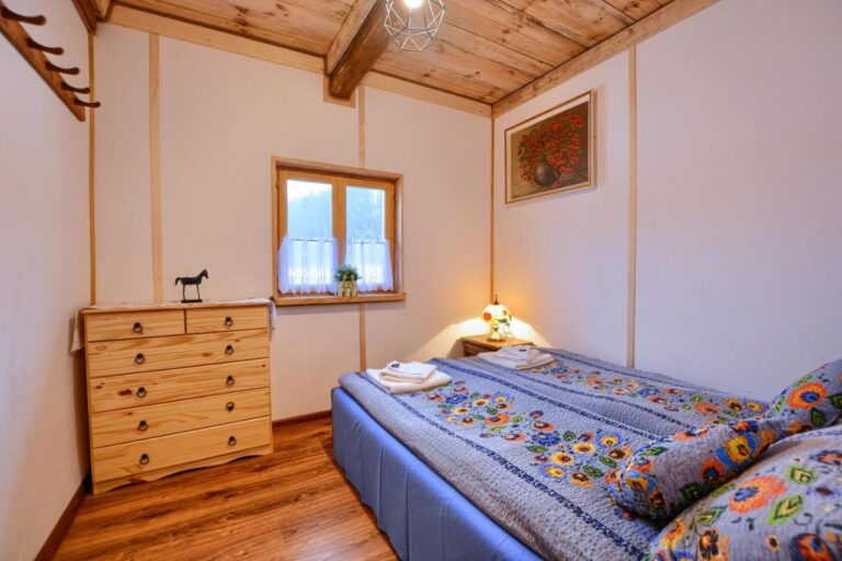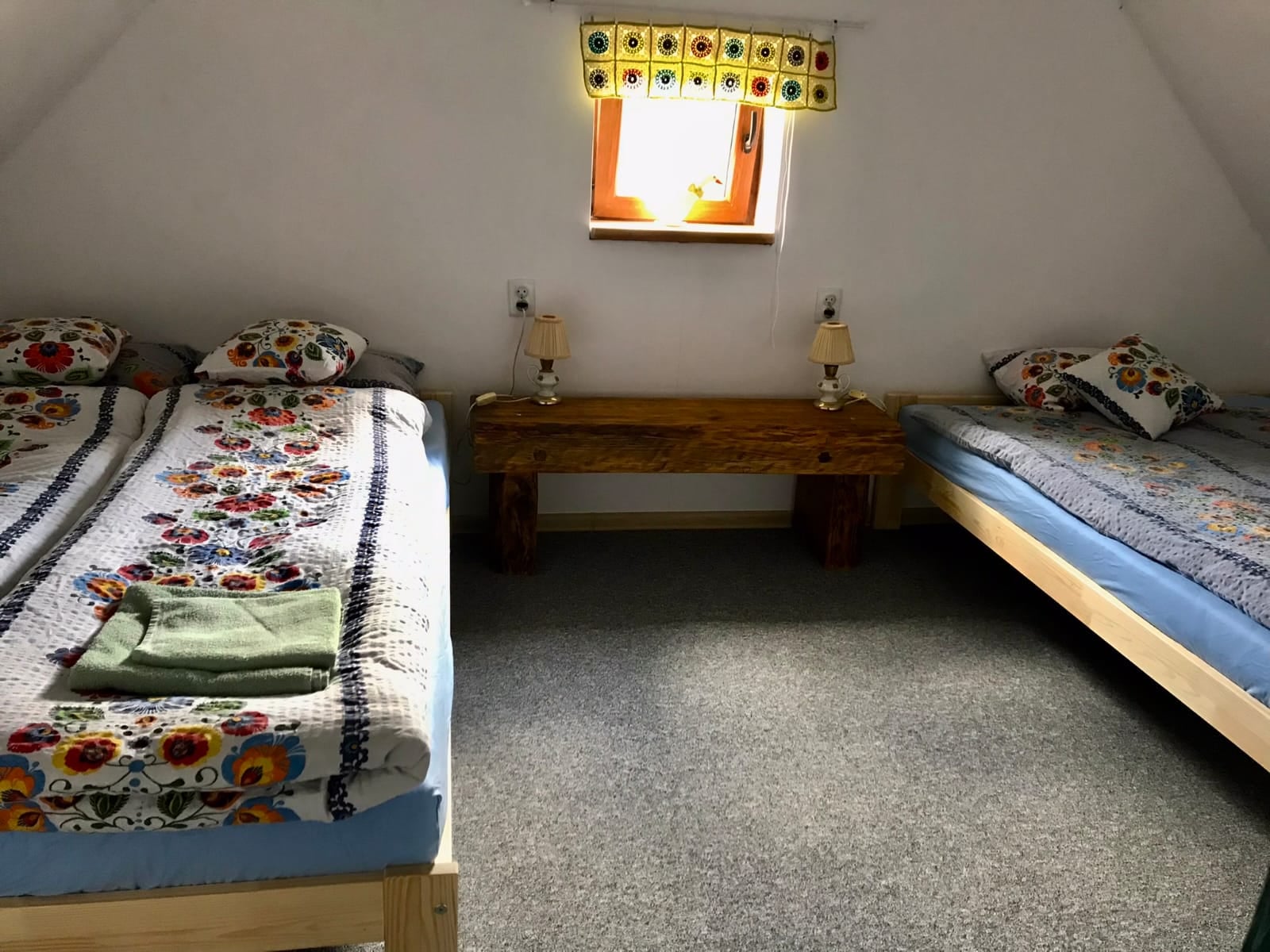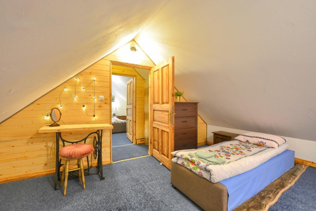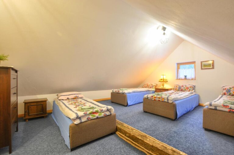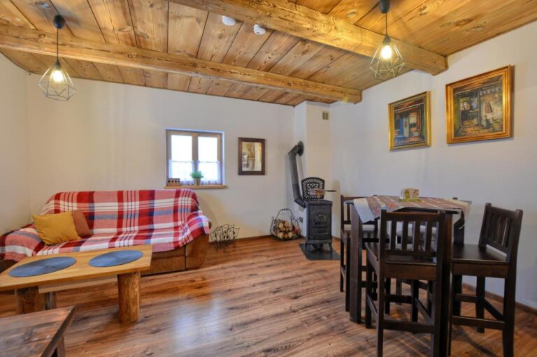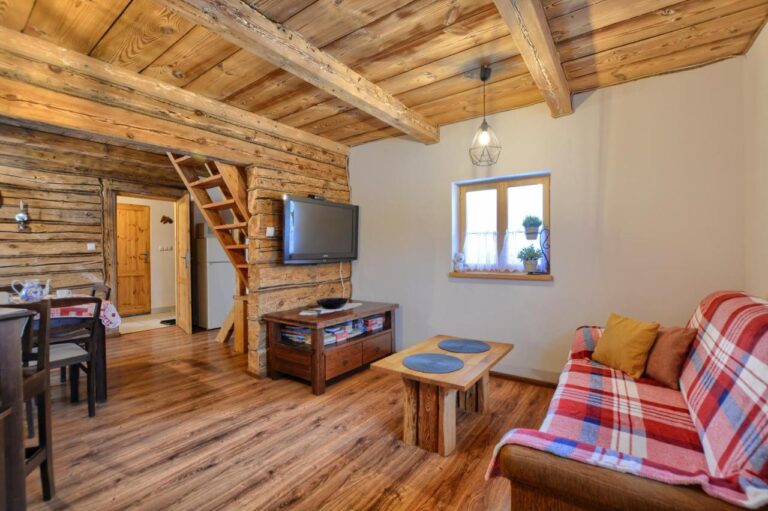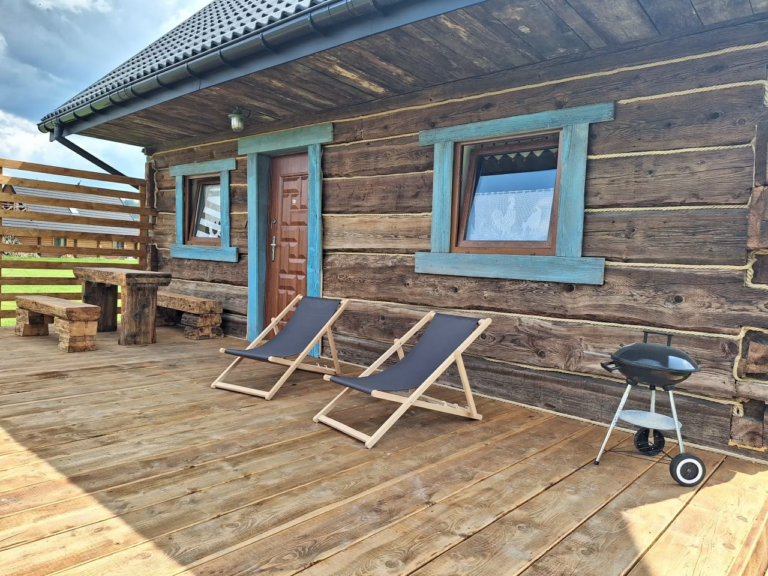 „Stara Chata” to stuletni domek przeniesiony i postawiony na nowo z zachowaniem sielskiego klimatu. Posiada trzy odrębne sypialnie, salon z kuchnią oraz łazienkę i pomieści 9 (max.11 osób-po rozłożeniu sofy w salonie). Na dole salon z kominkiem, kuchnia, dwuosobowa sypialnia, toaleta z prysznicem, przedpokój. Na górze dwa pokoje trzy i czteroosobowy.