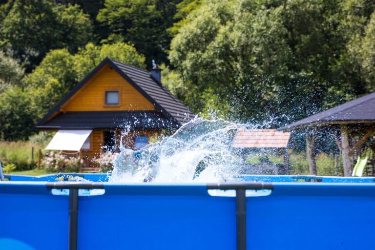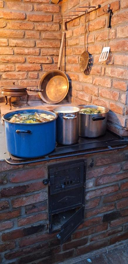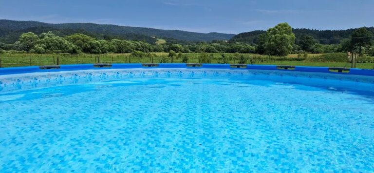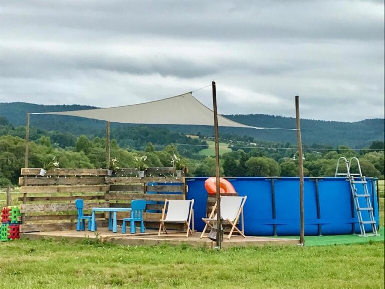 Latem duży (6m średnicy) basen, leżaki, ogniska w zadaszonej altanie.