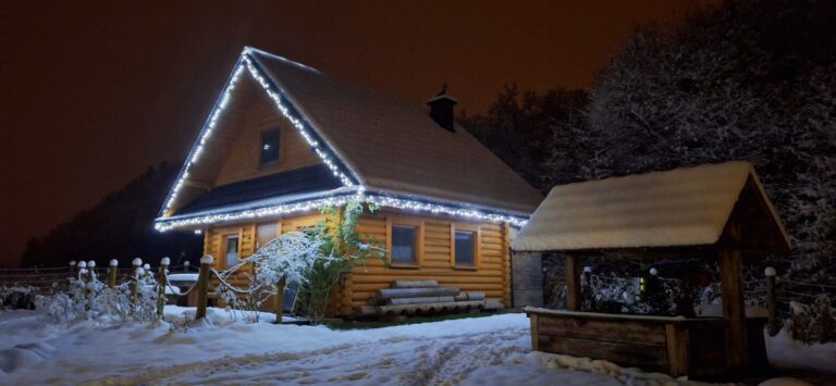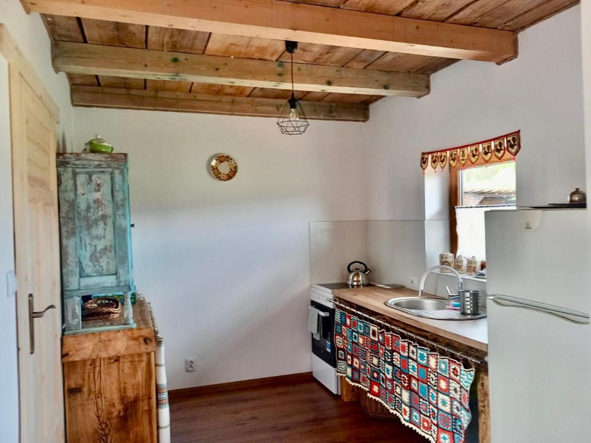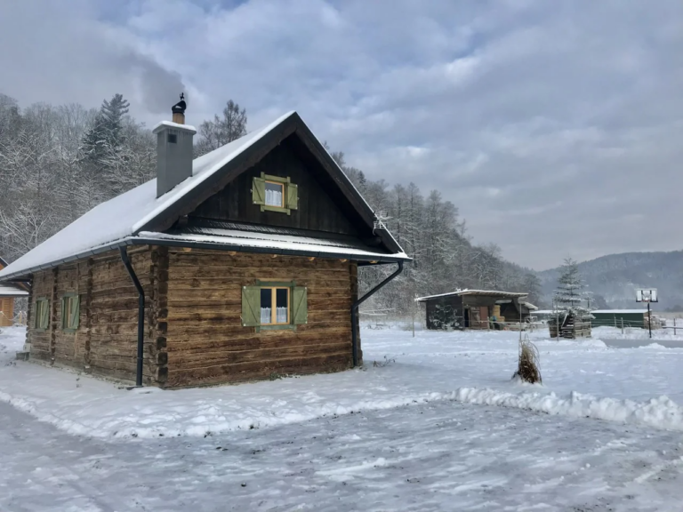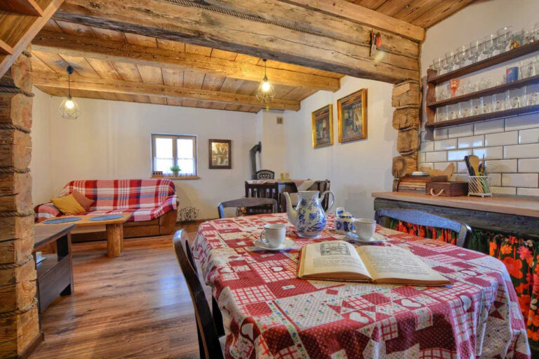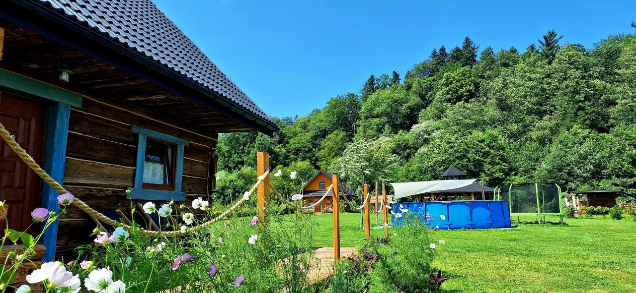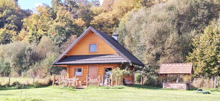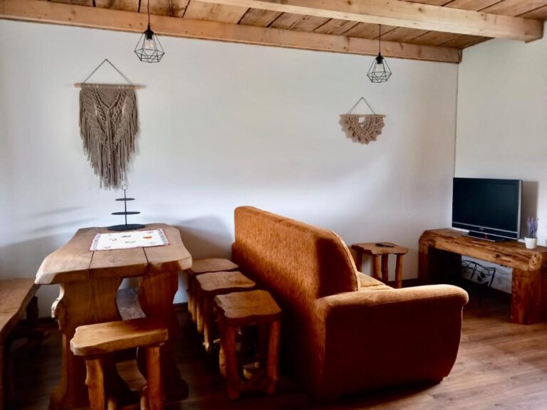 Trzeci domek to „Sobieńka”. Stara chatka przeniesiona i postawiona na nowo w 2023r, urządzona w wiejskim stylu, komfortowo i kompleksowo wyposażona. Pomieści maksymalnie dziesięć osób (w dwóch sypialniach po cztery osoby, z dodatkową możliwością rozłożenia dwuosobowej sofy w salonie). Domek posiada duży taras, z którego rozpościera się przepiękny widok na Ruiny Zamku Sobień.
